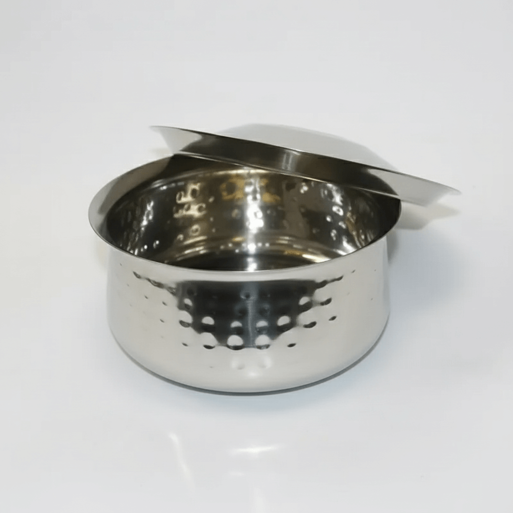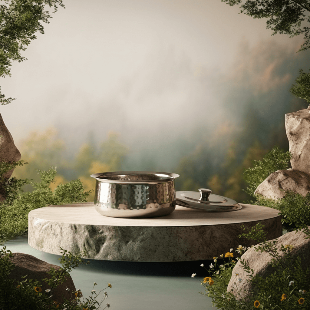 Traditional-style cookware set from Narmada Industries. 3-piece stainless steel set, ideal for induction and gas cooktops. Perfect for Indian cooking and offers excellent heat distribution.