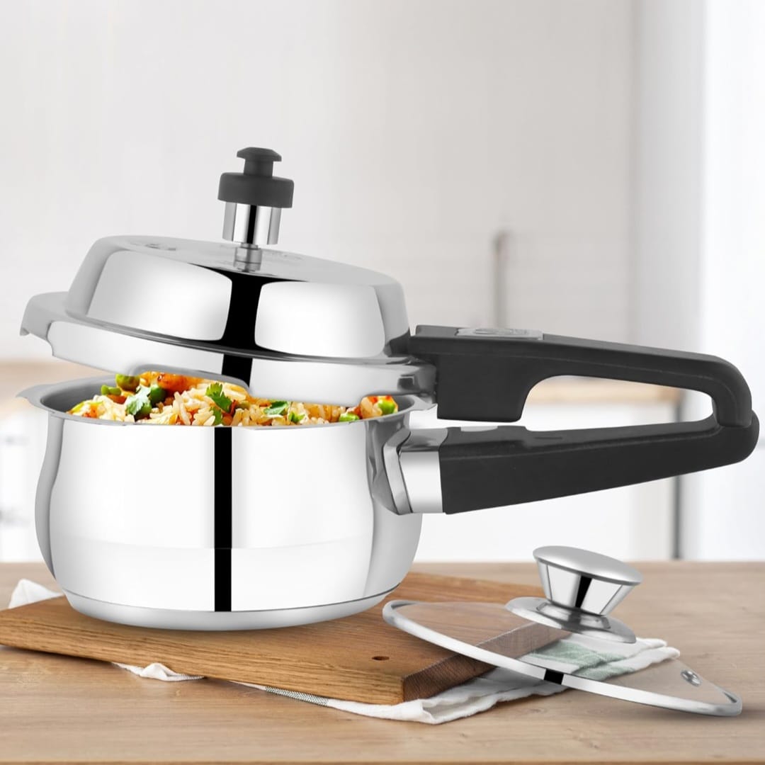 Narmada Industries SS Triply Cooker, a durable multi-layered stainless steel cookware set perfect for induction and gas stoves. Enjoy even heating and effortless cleanup. Crafted for lasting performance and everyday use.