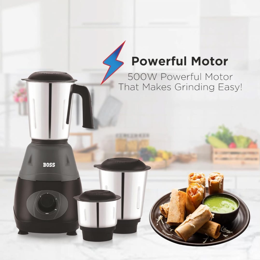 Narmada Industries Boss Bravo 500W Mixer Grinder With Powerful 500wMotor Unique Flow Breaker Design & Overload Protection (3 Stainless Steel Jars, Grey) for Kitchen